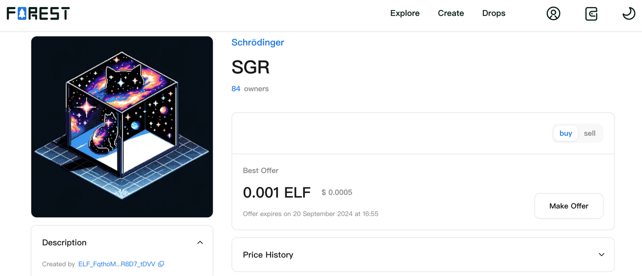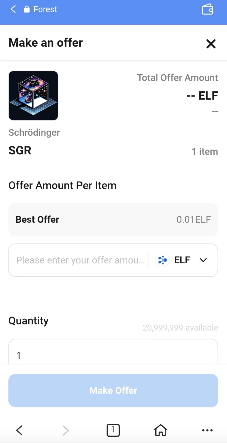 | <p><strong>Buying an $SGR NFT:</strong></p><ol start="1"><li>Visit <a href="https://www.eforest.finance/"><strong>Forest</strong></a> and connect your Portkey Wallet.</li></ol><p><img src="https://2359092669-files.gitbook.io/~/files/v0/b/gitbook-x-prod.appspot.com/o/spaces%2F36B0Clp7Y43nLu5VIg0T%2Fuploads%2FHXFjnrbgLGl2pxdLt7N2%2Ffd9fbae2-4102-482a-b859-29881581b858.png?alt=media&#x26;token=8e92cada-b305-42ed-9f60-6589a58bd88b" alt=""></p><ol start="2"><li>Click on the "Schrödinger" collection and click on the "SGR" NFT.</li></ol><p><img src="https://2359092669-files.gitbook.io/~/files/v0/b/gitbook-x-prod.appspot.com/o/spaces%2F36B0Clp7Y43nLu5VIg0T%2Fuploads%2F02PfZ3udqKw5YaZAsLtr%2F4a15ff34-afce-4e83-9f9b-6825bb4443e8.png?alt=media&#x26;token=5fa537a7-030e-4b57-a871-20f586202021" alt=""></p><p></p><ol start="3"><li>To make an offer, click on the "Make Offer" button and enter the specified price and quantity. You can also click the "Buy Now" button and enter the quantity to immediately purchase $SGR.</li></ol><p><img src="https://2359092669-files.gitbook.io/~/files/v0/b/gitbook-x-prod.appspot.com/o/spaces%2F36B0Clp7Y43nLu5VIg0T%2Fuploads%2Fw2kYSWAKOcsErp6QmDdg%2Fb845590d-7b93-4c35-bfe5-c6df1a95c9a2.png?alt=media&#x26;token=6c4b349e-4e6f-4fbd-8d28-cb938a0ffc9b" alt=""></p>                                                                                                                                                                                                                                                                        | <p><strong>Buying an $SGR NFT:</strong></p><ol start="1"><li>Visit <strong>Forest</strong> from Portkey's Discover page and connect your Portkey Wallet.</li></ol><p><img src="https://2359092669-files.gitbook.io/~/files/v0/b/gitbook-x-prod.appspot.com/o/spaces%2F36B0Clp7Y43nLu5VIg0T%2Fuploads%2FjKiqsCt1AAaLgzMFIbtA%2F2b1ddb41-9fd2-4aa7-99bf-c6220269d42f.png?alt=media&#x26;token=5a9938fe-4a86-4b6d-999d-dd005fe717c1" alt=""></p><ol start="2"><li>Click on the "Schrödinger" collection and click on the "SGR" NFT.</li></ol><p><img src="https://2359092669-files.gitbook.io/~/files/v0/b/gitbook-x-prod.appspot.com/o/spaces%2F36B0Clp7Y43nLu5VIg0T%2Fuploads%2FlDyVrTicVotsTZJ76Wmt%2F9fe59dfe-21fb-4517-9c86-7c2f9b98176b.png?alt=media&#x26;token=a1e327e4-7c29-49d0-b07d-fd96d0cfc87f" alt=""></p><ol start="3"><li>To make an offer, click on the "Make Offer" button and enter the specified price and quantity. You can also click the "Buy Now" button and enter the quantity to immediately purchase $SGR.</li></ol><p><img src="https://2359092669-files.gitbook.io/~/files/v0/b/gitbook-x-prod.appspot.com/o/spaces%2F36B0Clp7Y43nLu5VIg0T%2Fuploads%2FId8lCLTMUx6TNS6mg4cN%2Fbe9a2d25-b717-49e8-978d-1682e1613abd.png?alt=media&#x26;token=6f527184-89fa-4746-a5df-65061a237c2b" alt=""></p><p></p><p><strong>Note:</strong> The first operation will trigger a wallet connection request. Simply click on the "Approve" button to proceed.<br></p>                                                                                                                                 |