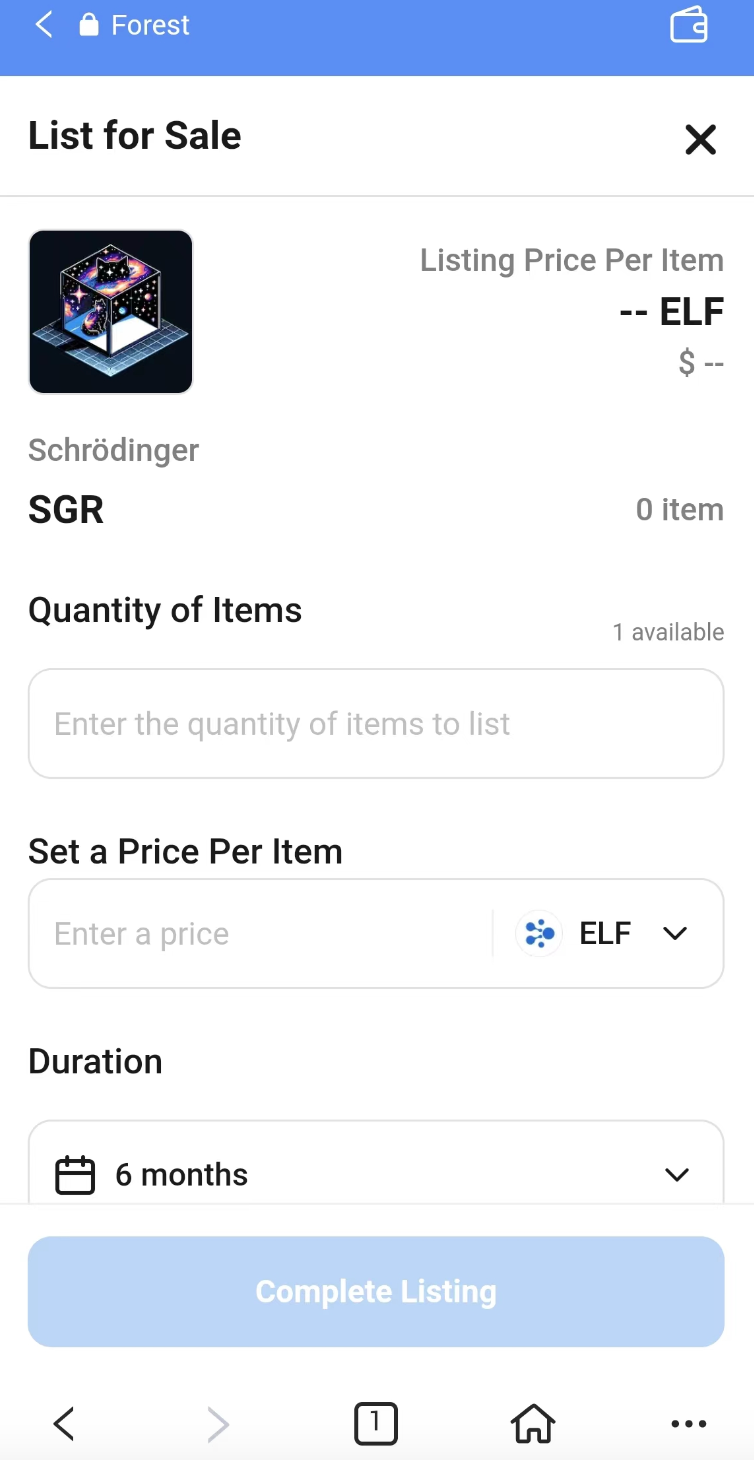 | <p><strong>Selling an $SGR NFT:</strong></p><ol start="1"><li>Visit <a href="https://www.eforest.finance/"><strong>Forest</strong></a> and connect your Portkey Wallet.</li></ol><p><img src="https://2359092669-files.gitbook.io/~/files/v0/b/gitbook-x-prod.appspot.com/o/spaces%2F36B0Clp7Y43nLu5VIg0T%2Fuploads%2FHXFjnrbgLGl2pxdLt7N2%2Ffd9fbae2-4102-482a-b859-29881581b858.png?alt=media&#x26;token=8e92cada-b305-42ed-9f60-6589a58bd88b" alt=""></p><ol start="2"><li>Click on the profile icon at the top right to go to your Profile.</li></ol><p><img src="https://2359092669-files.gitbook.io/~/files/v0/b/gitbook-x-prod.appspot.com/o/spaces%2F36B0Clp7Y43nLu5VIg0T%2Fuploads%2FJUAiShKND8fKc2ei6SP9%2F91c34e12-20e4-4fcc-afc3-31950b658f94.png?alt=media&#x26;token=868e3377-8b31-4e6a-be01-be88016a3363" alt=""></p><ol start="3"><li>Click on any $SGR NFT and click "Sell" to list your NFT for sale.</li></ol><p><img src="https://2359092669-files.gitbook.io/~/files/v0/b/gitbook-x-prod.appspot.com/o/spaces%2F36B0Clp7Y43nLu5VIg0T%2Fuploads%2F992lR3y700R7QzA6uata%2F1a0c4244-da11-4f77-b90a-99f7e488b5d2.png?alt=media&#x26;token=ed85ef62-26db-4c9e-8efa-034527627dea" alt=""></p><ol start="4"><li>Enter the price and quantity to sell, click on "Complete Listing" and authorize the transaction.</li></ol><p><img src="https://2359092669-files.gitbook.io/~/files/v0/b/gitbook-x-prod.appspot.com/o/spaces%2F36B0Clp7Y43nLu5VIg0T%2Fuploads%2FIZdCDbqv5ebwRx2CzG7U%2Ff274d132-a585-4662-8786-d60b6d9e12d3.png?alt=media&#x26;token=97acc03a-bb72-4933-98fc-188362e068cc" alt=""></p> | <p><strong>Selling an $SGR NFT:</strong></p><ol start="1"><li>Visit <strong>Forest</strong> from Portkey's Discover page and connect your Portkey Wallet.</li></ol><p><img src="https://2359092669-files.gitbook.io/~/files/v0/b/gitbook-x-prod.appspot.com/o/spaces%2F36B0Clp7Y43nLu5VIg0T%2Fuploads%2FjKiqsCt1AAaLgzMFIbtA%2F2b1ddb41-9fd2-4aa7-99bf-c6220269d42f.png?alt=media&#x26;token=5a9938fe-4a86-4b6d-999d-dd005fe717c1" alt=""></p><ol start="2"><li>Click on the top right icon and click on "Profile" to go to your Profile.</li></ol><p><img src="https://2359092669-files.gitbook.io/~/files/v0/b/gitbook-x-prod.appspot.com/o/spaces%2F36B0Clp7Y43nLu5VIg0T%2Fuploads%2FpauNr44vofhCl2AFITWh%2F4aae5331-0b98-4279-a56a-da0dfa7e57bb.jpeg?alt=media&#x26;token=4220b30f-749f-420d-bc48-5460c52283ab" alt=""></p><ol start="3"><li>Click on any $SGR NFT and click "Sell" to list your NFT for sale.</li></ol><p><img src="https://2359092669-files.gitbook.io/~/files/v0/b/gitbook-x-prod.appspot.com/o/spaces%2F36B0Clp7Y43nLu5VIg0T%2Fuploads%2FBsenTA5e3qpwnhW8nAtp%2F27cb7a38-813f-4014-85b4-27529225d5b9.png?alt=media&#x26;token=968e4cd3-2db3-4aa0-9938-70e80a471c21" alt=""></p><ol start="4"><li>Enter the price and quantity to sell, click on "Complete Listing" and authorize the transaction.</li></ol><p><img src="https://2359092669-files.gitbook.io/~/files/v0/b/gitbook-x-prod.appspot.com/o/spaces%2F36B0Clp7Y43nLu5VIg0T%2Fuploads%2F0485ZzPh4hWxMwtzLb4R%2F919f7615-8ced-4f1b-90bf-358347cd6f82.png?alt=media&#x26;token=eabb4e6e-d563-4374-aa65-5b6208c1ec41" alt=""></p> |